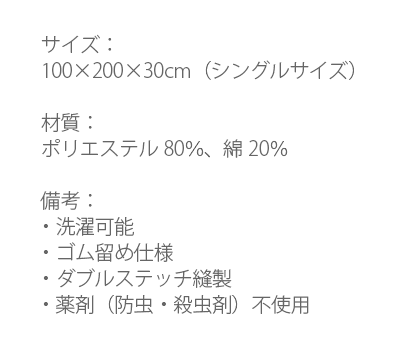サイズ: 100×200×30cm(シングルサイズ) 材質: ポリエステル80%、綿20% 備考: 洗濯可能、ゴム留め仕様、ダブルステッチ縫製、薬剤(防虫・殺虫剤)不使用