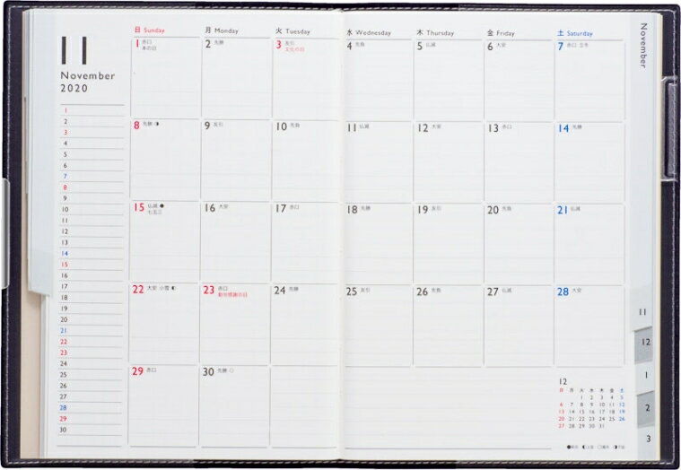 ・商品仕様・スペック・ISBN・978-4-471-79621-1・本体サイズ・B6判(182×128mm)・ページ数・120・レイアウト・4月始まり / 日曜始まり・装丁仕様・皮革調・月間予定表・月間予定表ブロック・週間予定表・マンスリータイプ・月間予定表記入欄・2020年3月〜2021年4月・週間予定表記入欄・なし・こだわりの付録・年齢早見表・マイカレンダー・テレフォンリスト・アドレスメモ・切り取りメモ・方眼メモ・地下鉄路線図/東京・大阪近郊鉄道路線図(別紙)・カバーは選べる3種類・月間予定表のみのスリムタイプ。